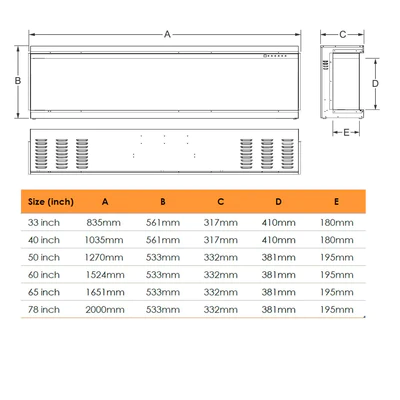 - Designed with front flow heating with hidden venting, The venting is located at the top of the unit allowing heat to cascade down in front of the glass.