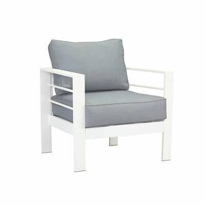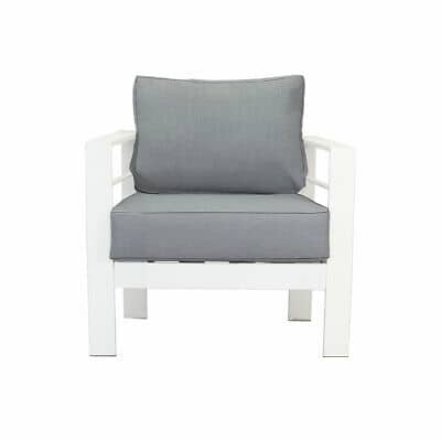 Available in light grey cushion and white powder-coated aluminium frame, the neutral colour palette allows the Paris 5-seater Outdoor Lounge Setting to look great in any outdoor space.